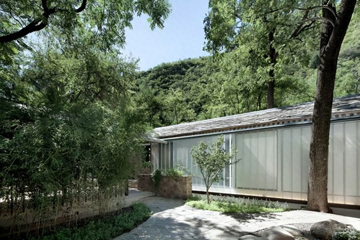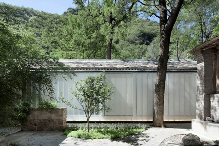 室内就餐区直接通联到了室外凉亭,而透过客厅又可以看到自然的山石景观。为了保证主要居住空间的私密性,同时也为了避免将最美的山景开门即见,我们在正房面向入口院落一侧加盖了外廊,上方的玻璃顶让斑驳树影和灿烂阳光洒进室内,半透明的U型玻璃墙将苍翠的山景藏于其后,它所包裹的空间里渗出的光影又象灯笼一样照亮了院落。