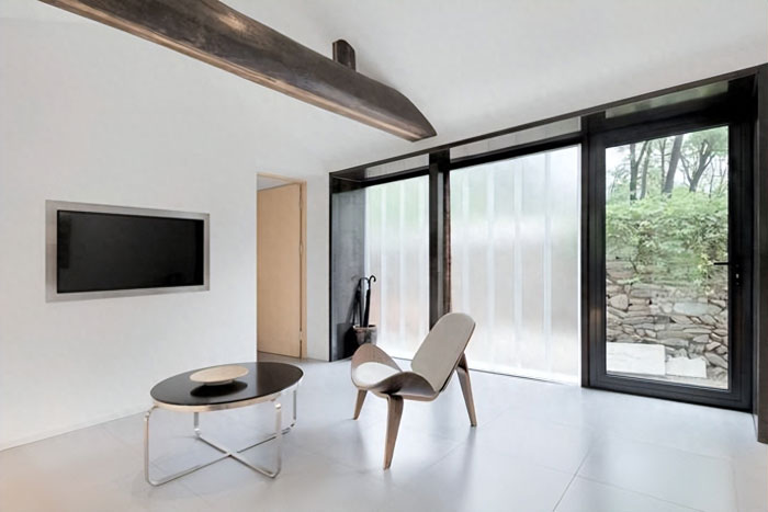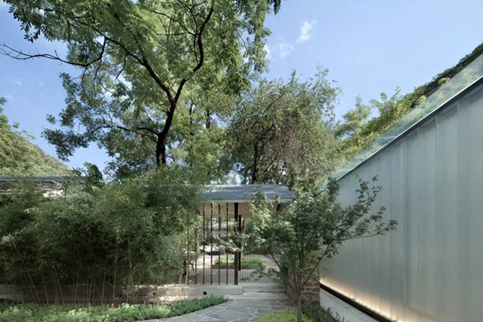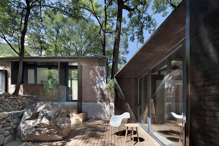 原有的建筑中布置了六间卧室,依照实际情况形态各有不同,有的自带起居室,有的淋浴间可以直面山景。南侧的山坡同建筑自然围合成了一个小的开放空间,我们把这里设计成了一个私密的休憩平台,原有的山石被保留在了平台中央成为了视觉焦点。原有的封闭陈旧的建筑立面被通透的玻璃幕墙所替代。