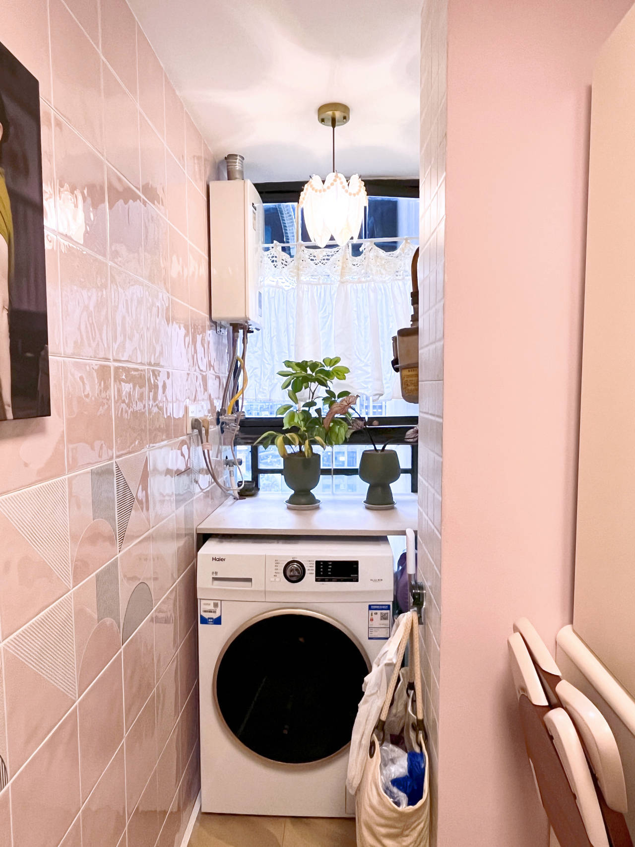 墙砖进行红绿撞色铺设,以玻璃隔断为中介线;